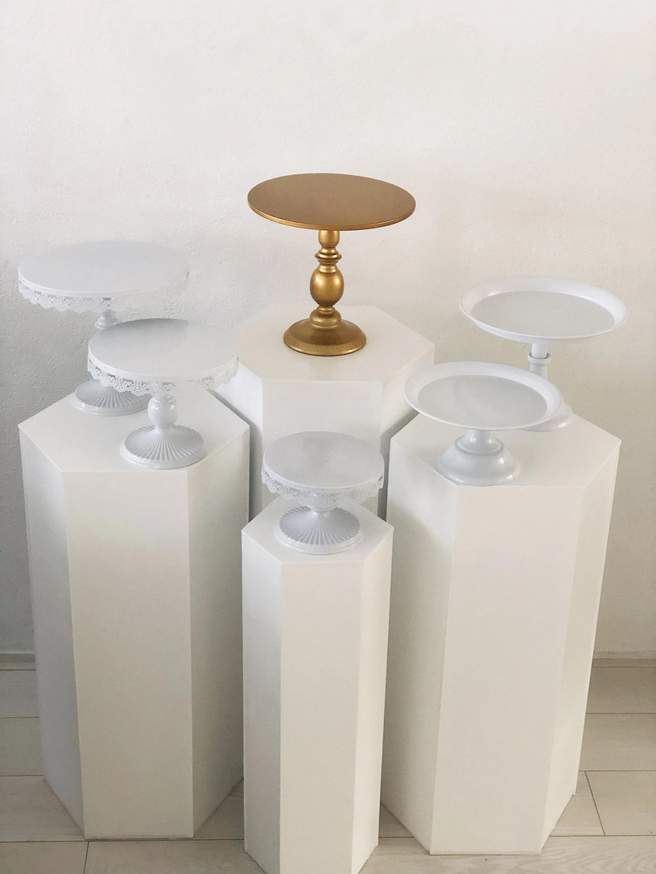 Neem een kijkje in de voorraad met diverse items van pilaren tot taartplateaus en stoelhoezen.